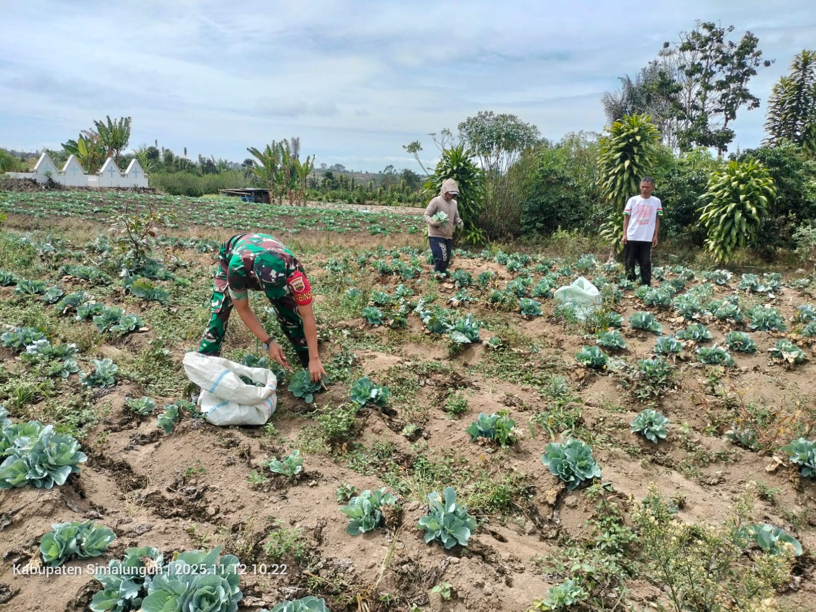 Media sinergitas TNI-Polri News, Simalungun – Dengan semangat kebersamaan dan kepedulian terhadap warga binaan, Babinsa Koramil 12/Saribudolok Kodim 0207/Simalungun, Kopda E.S. Sijabat, turun langsung ke ladang membantu petani memanen sayur di Nagori Ujung Saribu, Kecamatan Pamatang Silimakhuta, Kabupaten Simalungun, pada Rabu (12/11/2025).