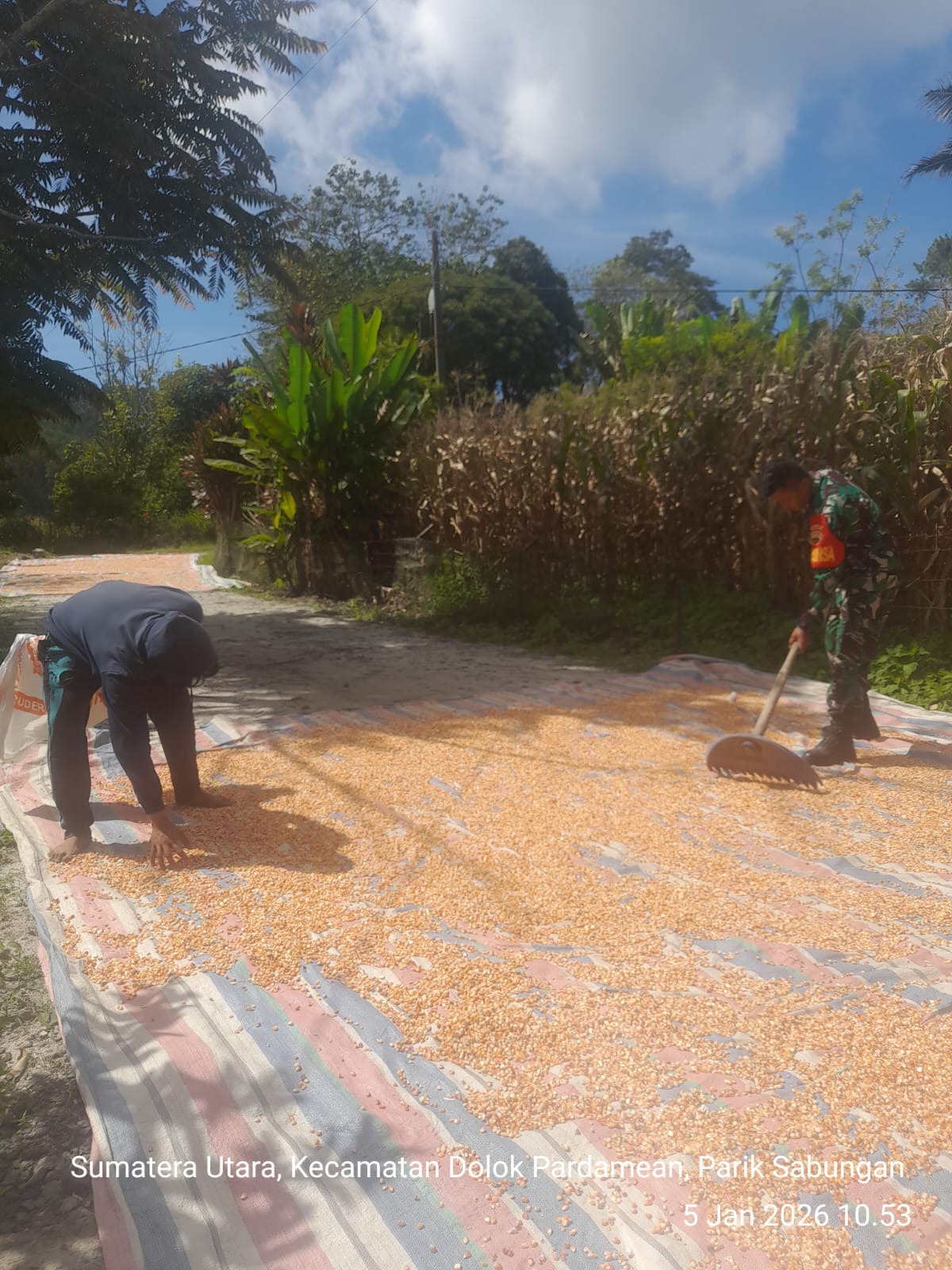 Kegiatan tersebut berlangsung di Nagori Parik Sabungan, Kecamatan Dolok Pardamean, Kabupaten Simalungun, bersama salah satu warga binaan, Bapak Purba, yang tengah mengolah hasil panen jagungnya. Dengan penuh keakraban, Sertu Josua ikut turun langsung membantu proses penjemuran jagung agar hasil panen tetap terjaga kualitasnya.