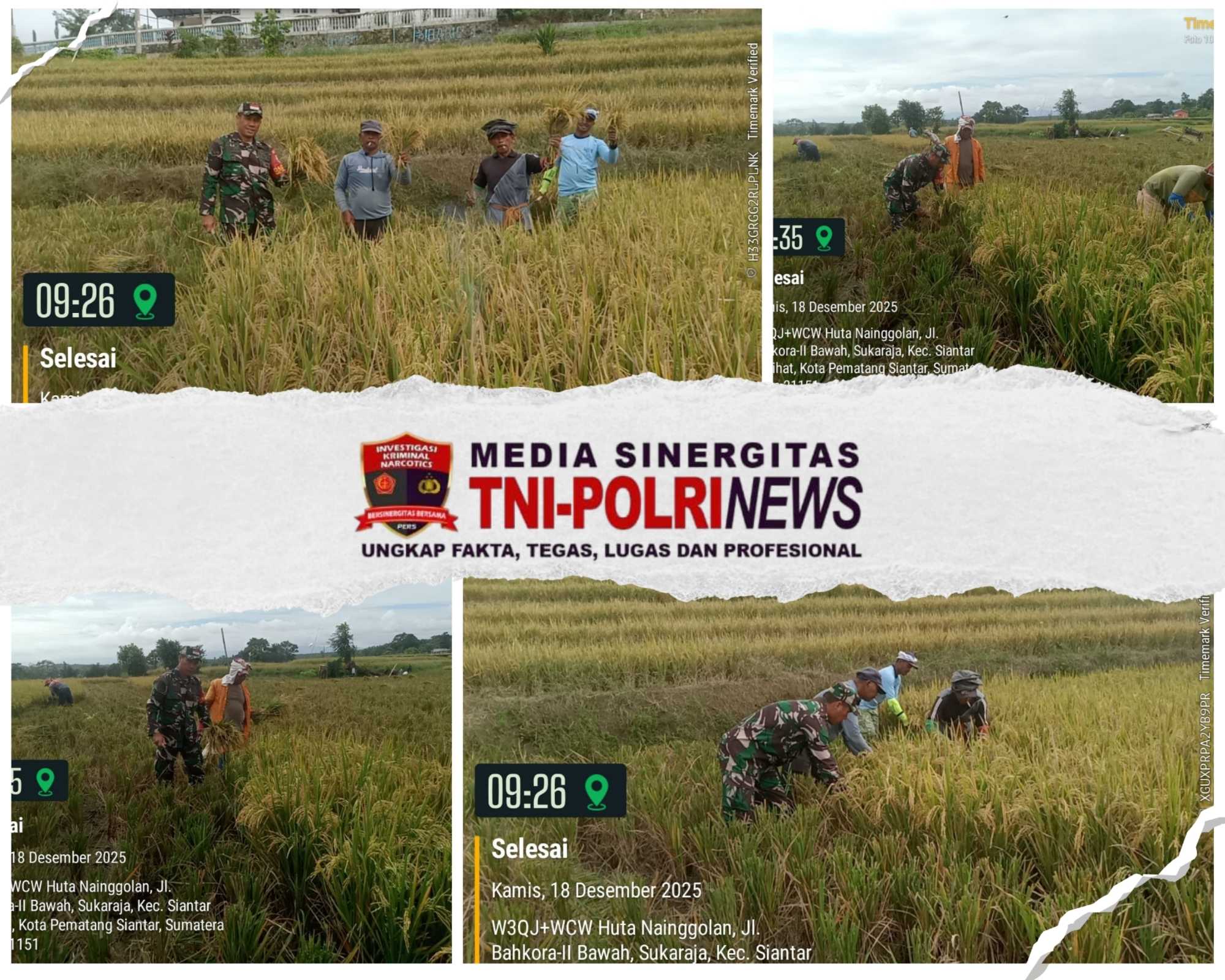 Media Sinergitas TNI-Polri News, Pematang Siantar – Kebersamaan TNI dengan masyarakat kembali terlihat dalam kegiatan panen padi yang dilaksanakan oleh Kelompok Tani Nainggolan di Kelurahan Sukaraja, Kecamatan Siantar Marihat, Kota Pematang Siantar, Kamis (18/12/2025).
