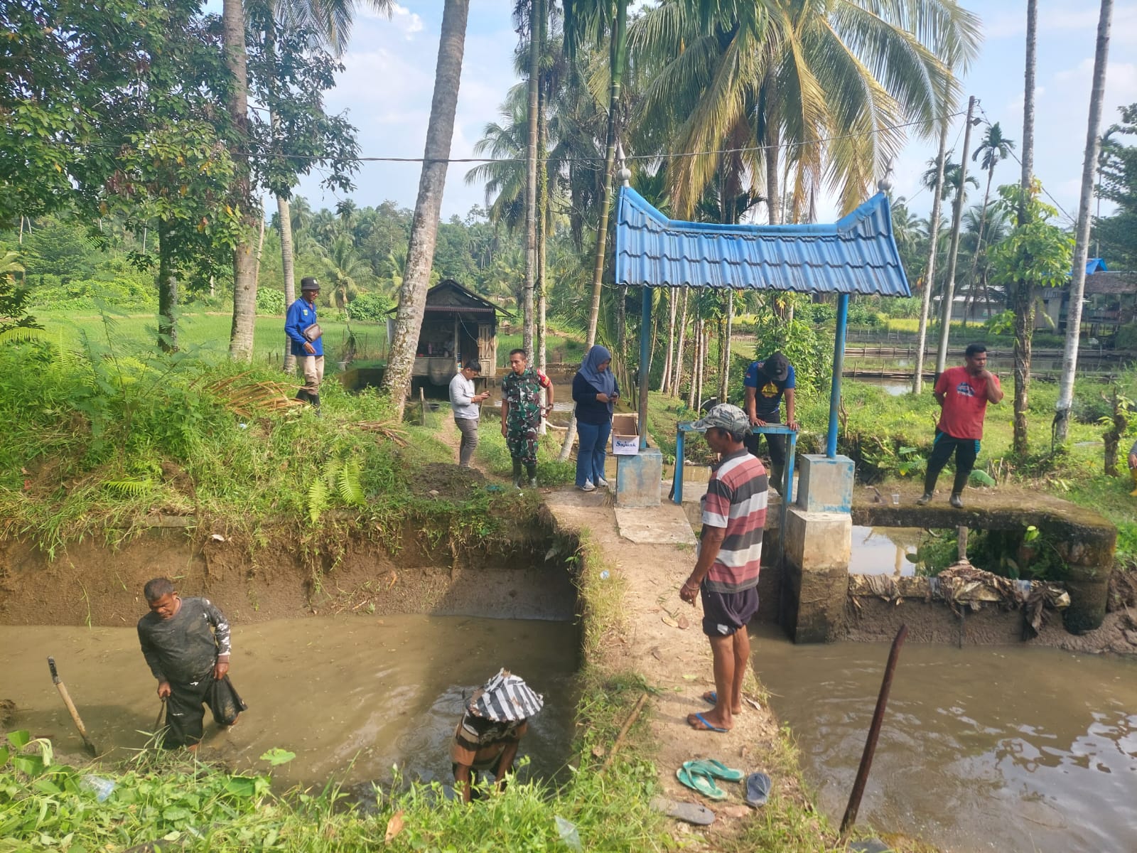 Media Sinergitas TNI-Polri News, SUNGAI SARIAK, – Babinsa Koramil 03/Sungai Sariak Kodim 0308/Pariaman Sertu Mairizal,Sertu Jhonmex Candra,Serda Rubel Antonius DM dan Koptu Aprisal melaksanakan gotong royong bersama warga dan aparat pemerintah membersihkan saluran irigasi di nagari Sungai Sariak Kecamatan VII Koto Sungai Sariak kabupaten Padang Pariaman.