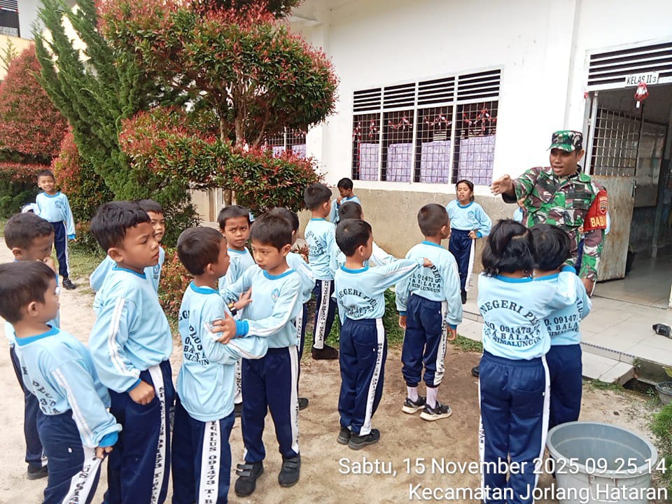 “Adik-adik harus rajin belajar dan berani bermimpi. Masa depan bangsa berada di tangan kalian,” tutur Serda Jataksir Purba saat memberikan arahan kepada para siswa.
