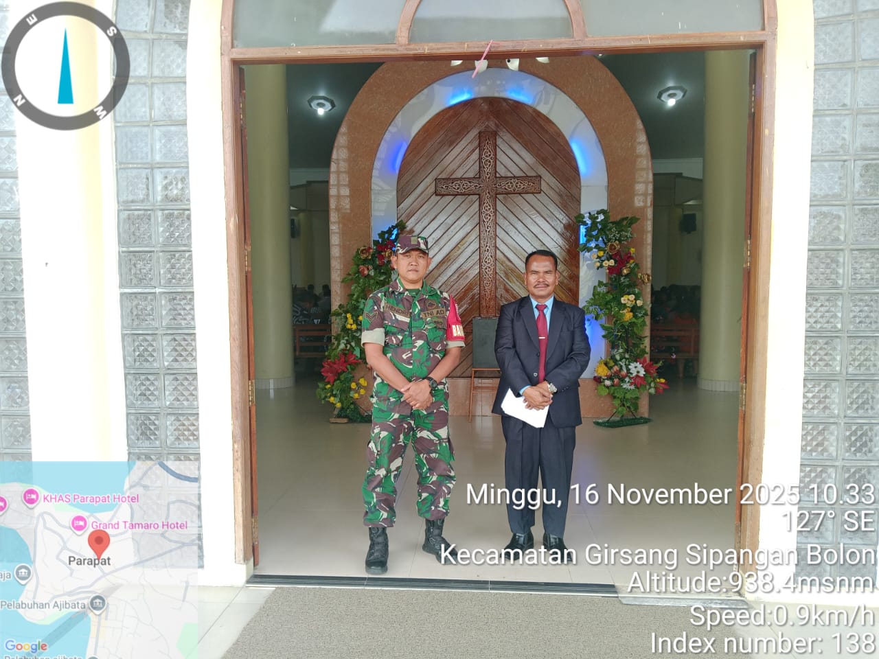Media sinergitas TNI-Polri News, Girsang Sipangan Bolon, 16 November 2025 – Dalam rangka menjaga keamanan dan kenyamanan jalannya ibadah umat Kristiani, Sertu Hendri Susanto, Babinsa Koramil 11/Girsang Sipangan Bolon Kodim 0207/Simalungun, melaksanakan tugas pengamanan pada pelaksanaan Ibadah Minggu di Gereja HKBP Parapat, Kecamatan Girsang Sipangan Bolon.