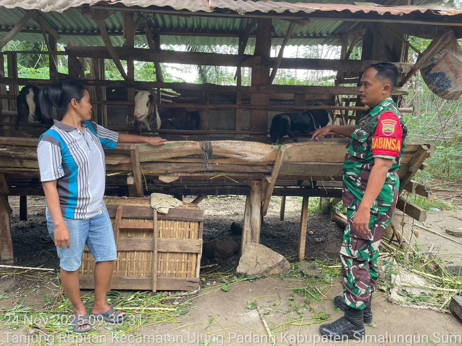 Media sinergitas TNI-Polri News, Simalungun – Dalam upaya mendukung kesejahteraan masyarakat serta menjaga ketahanan pangan di tingkat desa, Babinsa Koramil 07/Bosar Maligas Kodim 0207/Simalungun, Sertu Chairul Afandi, melaksanakan kegiatan Komunikasi Sosial (Komsos) bersama peternak kambing Ibu Sumini, pada Senin, 24 November 2025, di Nagori Tanjung Rapuan, Kecamatan Ujung Padang, Kabupaten Simalungun.