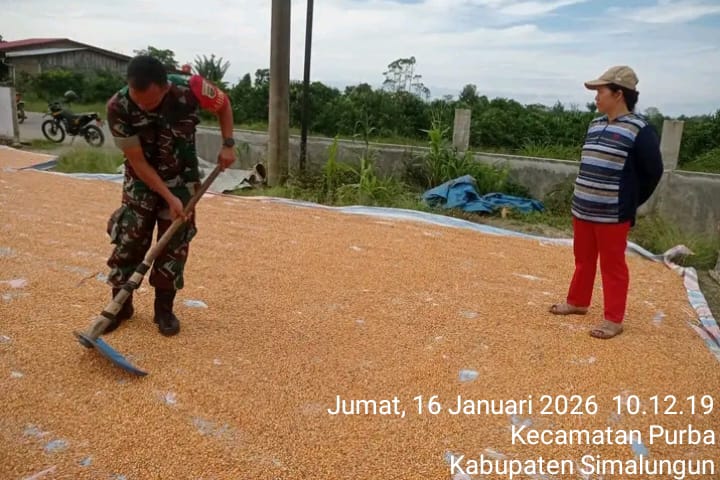 Media Sinergitas TNI-Polri News, Simalungun – Wujud kepedulian TNI terhadap masyarakat terus ditunjukkan melalui kehadiran Babinsa di wilayah binaan. Babinsa Koramil 13/Purba Kodim 0207/Simalungun, Sertu S. Tambunan, pada Jumat (16/1/2026) melaksanakan kegiatan anjangsana sekaligus membantu petani menjemur jagung di Nagori Purba Tongah, Kecamatan Purba, Kabupaten Simalungun.