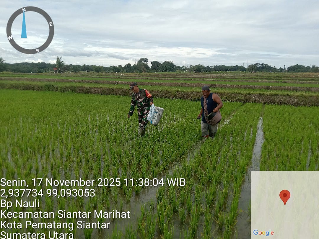 Media sinergitas TNI-Polri News, Pematang Siantar – Senin, 17 November 2025, Sebagai wujud nyata kedekatan TNI dengan masyarakat, Babinsa Koramil 03/Siantar Selatan Kodim 0207/Simalungun, Sertu D. Sirait, turun langsung membantu kegiatan pemupukan padi milik Kelompok Tani Idaman yang diketuai Bapak Marojahan Aritonang. Kegiatan berlangsung di area persawahan Dusun Sukaslamat, Kelurahan Bahapal Nauli, Kecamatan Siantar Marihat, Kota Pematang Siantar.