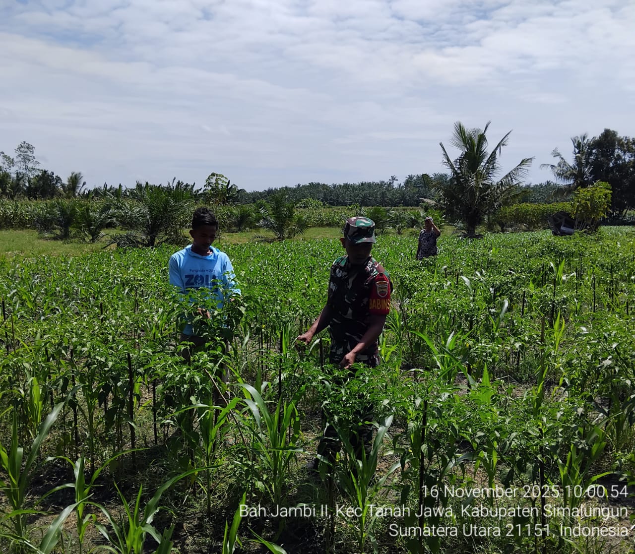 Dalam kegiatan tersebut, Serda H. Purba ikut membantu salah satu petani setempat, Bapak Naseb, melakukan panen cabai sekaligus melihat langsung perkembangan tanaman komoditas pertanian lainnya. Kehadiran Babinsa di ladang tidak hanya sebagai pendamping, tetapi juga sebagai bentuk dukungan moril bagi para petani yang menjadi tulang punggung ketahanan pangan di wilayah tersebut.