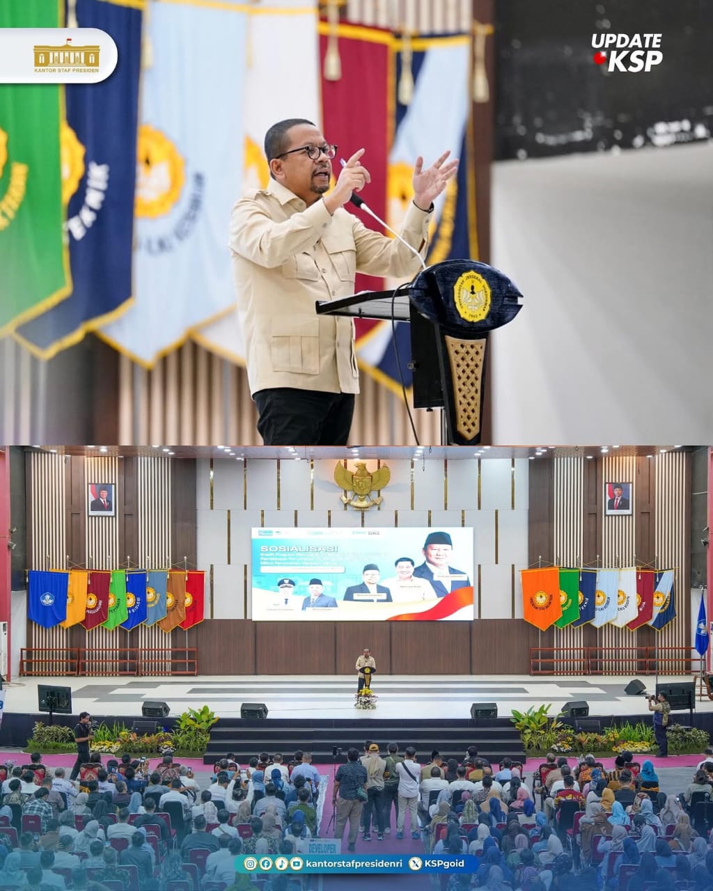 Media Sinergitas TNI-Polri News,Purwekerto. – Kepala Staf Kepresidenan, Muhammad Qodari, menghadiri acara sosialisasi Kredit Usaha Rakyat (KUR) Perumahan dan FLPP, SMF, serta PNM Melawan Rentenir di Auditorium Graha Widyatama Prof. Rubijanto Misman, Universitas Jenderal Soedirman (Unsoed) Purwokerto, Sabtu (8/11). Dalam sambutannya, Kepala Staf Kepresidenan menekankan pentingnya semangat kolaborasi untuk mempercepat akses pembiayaan perumahan dan pemberdayaan ekonomi masyarakat, terutama bagi masyarakat berpenghasilan rendah.