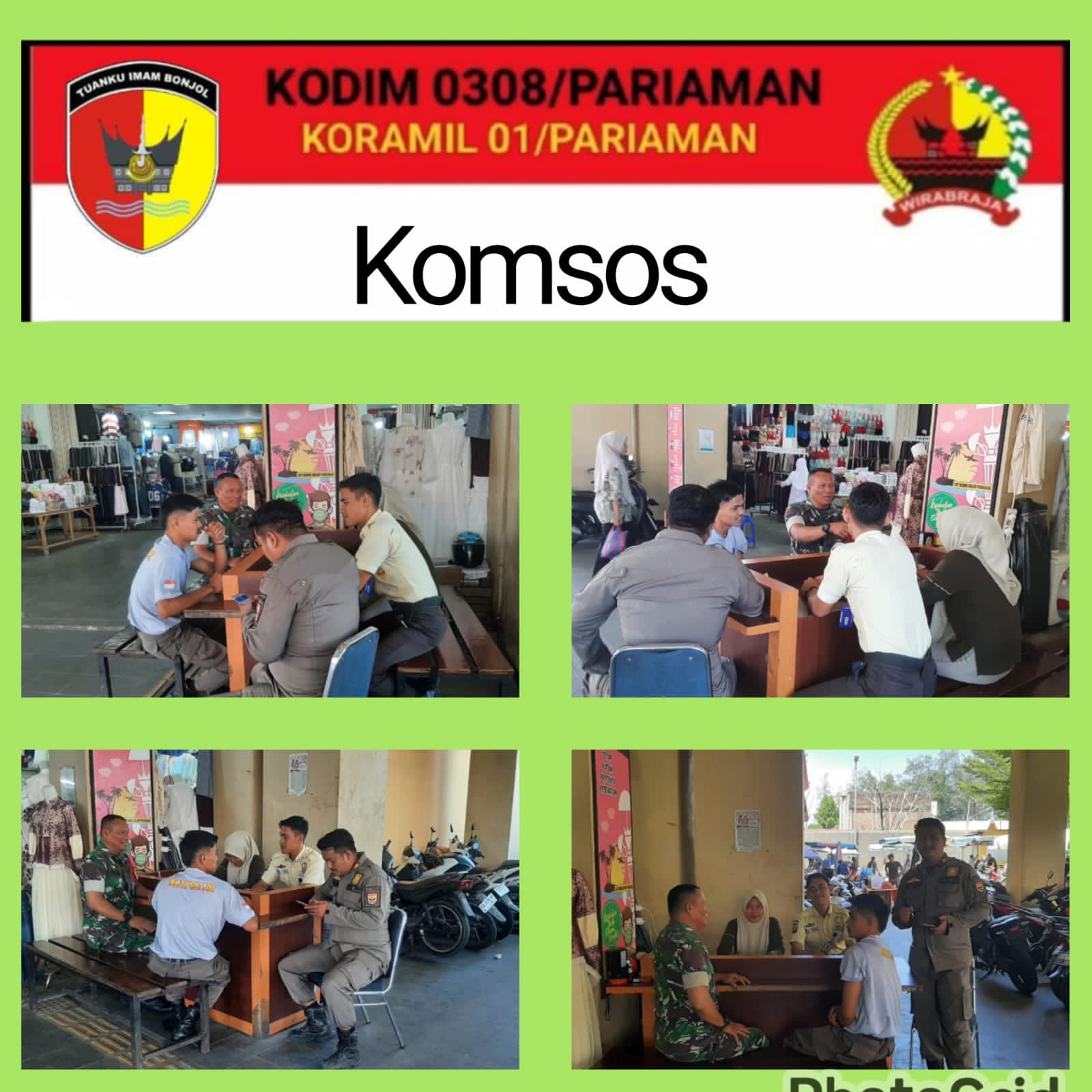 Babinsa Sertu Jon Endri dalam kegiatan Komsosnya mengatakan, kegiatan ini untuk mencerminkan rasa kemanunggalan TNI khususnya Babinsa kepada masyarakat wilayah binaannya. Tujuan Komsos ini juga untuk mengetahui perkembangan situasi di wilayah binaan, dengan adanya interaksi komunikasi Babinsa dengan warga akan dapat mempererat hubungan TNI dan Rakyat.