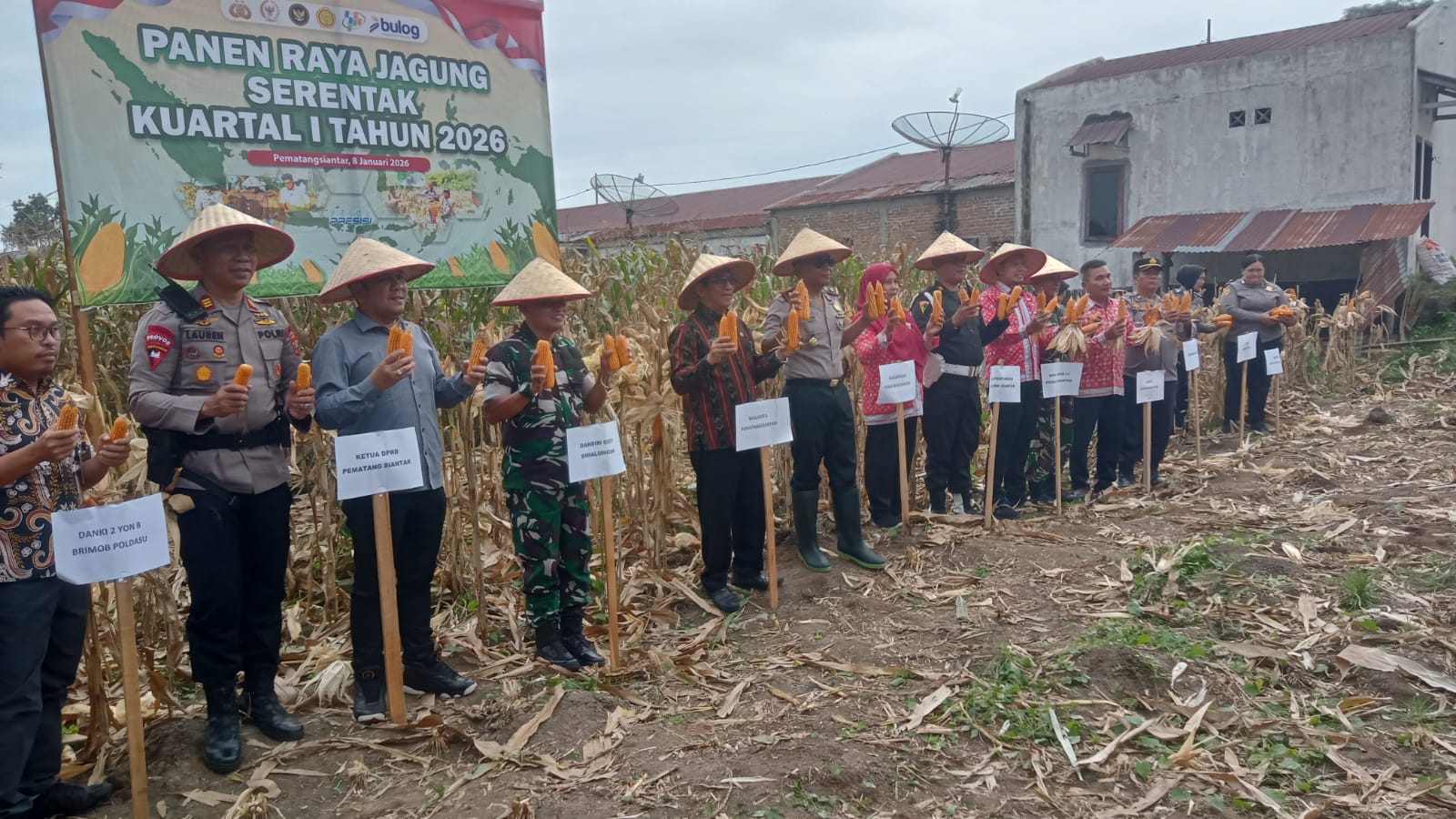 Panen raya jagung ini turut dihadiri oleh berbagai unsur Forkopimda dan instansi terkait, di antaranya Asisten Perekonomian Kota Pematangsiantar Zainal Siahaan, S.E., M.M., Wakapolres Pematangsiantar Kompol Budi, Dandenpom I/1 yang diwakili Kapten Cpm A. Siahaan, Kejari Pematangsiantar yang diwakili Hery Situmorang, S.H., M.H., Ketua DPRD Kota Pematangsiantar yang diwakili Hendra Pardede, Danramil 01/Siantar Utara Kapten Inf Zulfan H, Kapolsek Martoba AKP Martua Damanik, Danki 2 Brimob AKP Lauren Siahaan, Camat Siantar Martoba Rilan Pohan, STTP, Lurah Sumber Jaya Sofian Siregar, S.H., pemilik ladang, serta seluruh Penyuluh Pertanian Lapangan (PPL) Kecamatan Martoba.