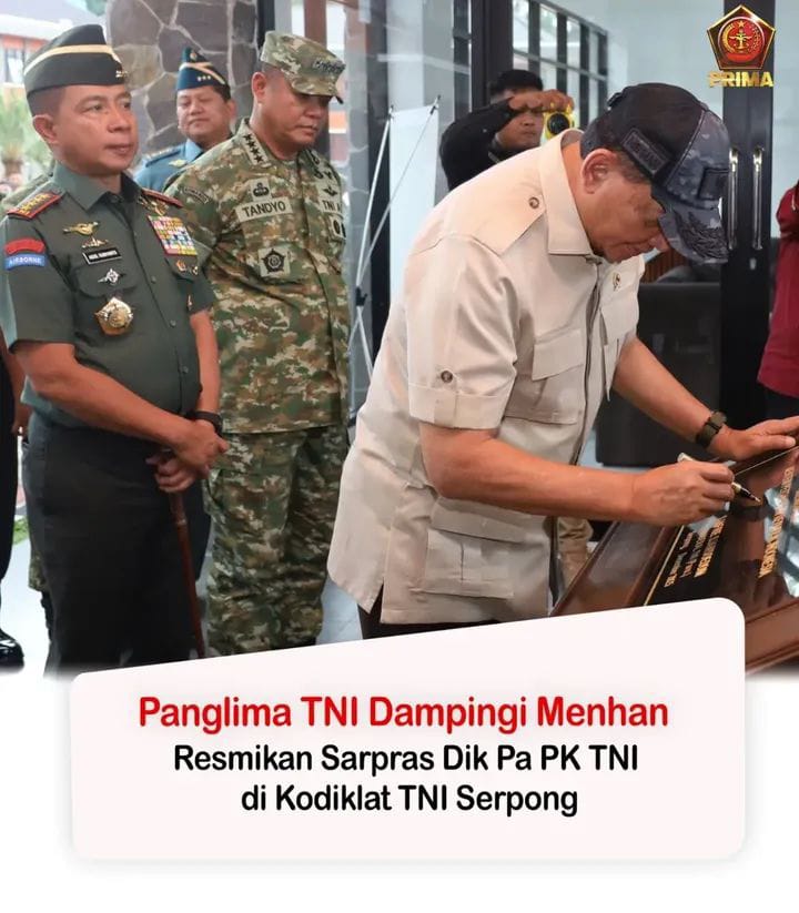 Media Sinergitas TNI-Polri News, (Puspen TNI). Panglima Tentara Nasional Indonesia (TNI) Jenderal TNI Agus Subiyanto mendampingi Menteri Pertahanan Republik Indonesia Sjafrie Sjamsoeddin dalam peresmian Sarana Prasarana Pendidikan Sekolah Perwira Prajurit Karir (Sarpras Dik Pa PK) TNI di Kodiklat TNI, Jalan Buaran Hankam, Serpong, Tangerang, Senin (29/12/2025).