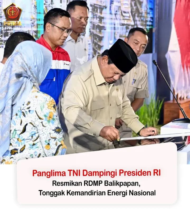 Media Sinergitas TNI-Polri News, (Puspen TNI). Panglima TNI Jenderal TNI Agus Subiyanto mendampingi Presiden Republik Indonesia Prabowo Subianto dalam peresmian infrastruktur energi terintegrasi Pertamina Refinery Development Master Plan (RDMP) Balikpapan yang berlangsung di Kantor Besar PT Pertamina (Persero) Refinery Unit V, Kota Balikpapan, Provinsi Kalimantan Timur, Senin (12/1/2026).