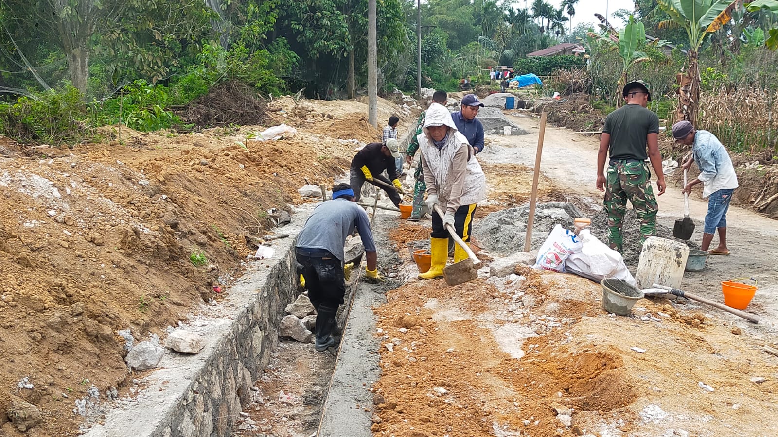 Sejak pagi hari, prajurit TNI bersama warga tampak kompak menggali saluran, menyusun batu, hingga merapikan konstruksi drainase. Irama kerja yang teratur berpadu dengan semangat gotong royong menjadikan lokasi pembangunan terasa hidup dan inspiratif untuk disaksikan.