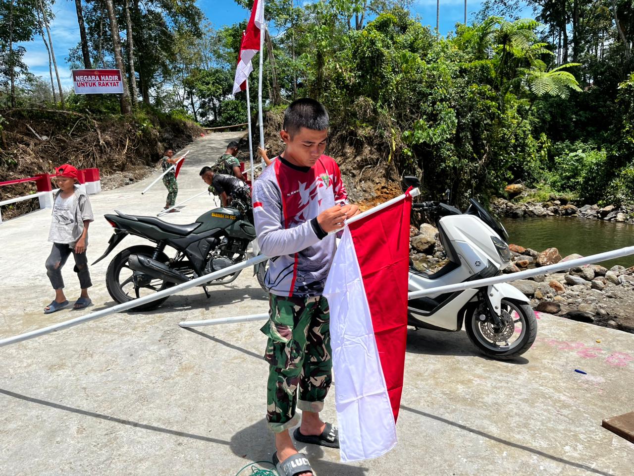 Saat ini, progres pembangunan telah memasuki tahap akhir, yakni finishing pengencangan baut jembatan dan pemasangan tiang bendera merah putih yang di bantu Babinsa 04/Sicincin Serka Suardi.