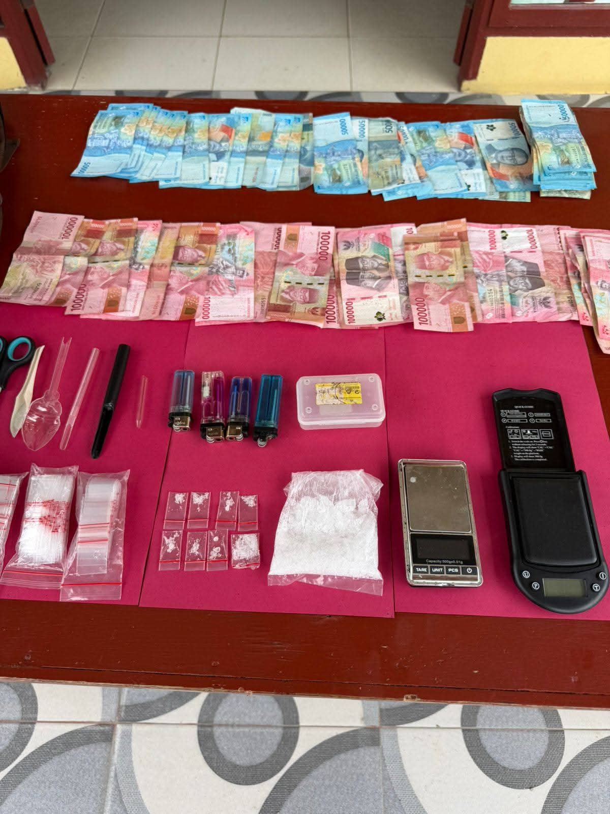 Dari hasil penggeledahan di sekitar rumah, petugas menemukan 8 paket kecil diduga sabu, dua unit timbangan digital, serta berbagai perlengkapan yang diduga digunakan untuk mengemas narkotika. Tidak hanya itu, dari tas yang sebelumnya dibuang pelaku, ditemukan satu paket besar sabu beserta alat pendukung lainnya.