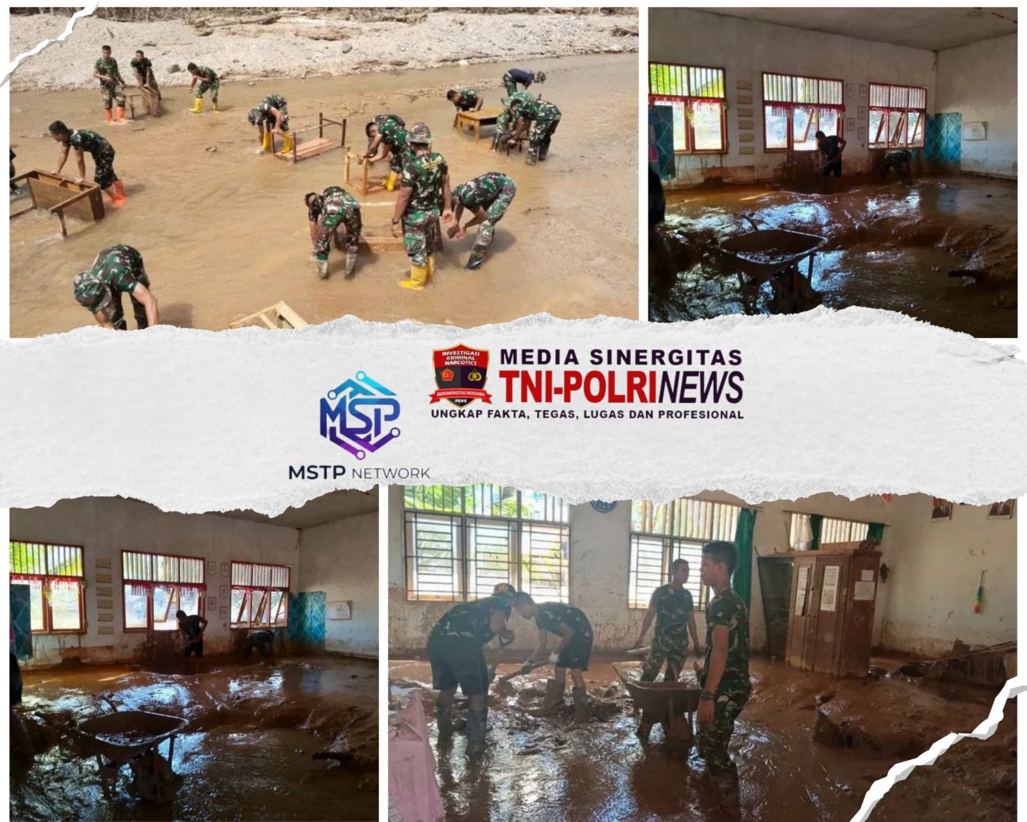 Fokus pembersihan meliputi lumpur di dalam dan depan ruang kelas, penyusunan meja kursi, pembuatan dinding pembatas teras, serta penyemprotan dinding dan lantai agar lingkungan sekolah kembali bersih dan layak digunakan.