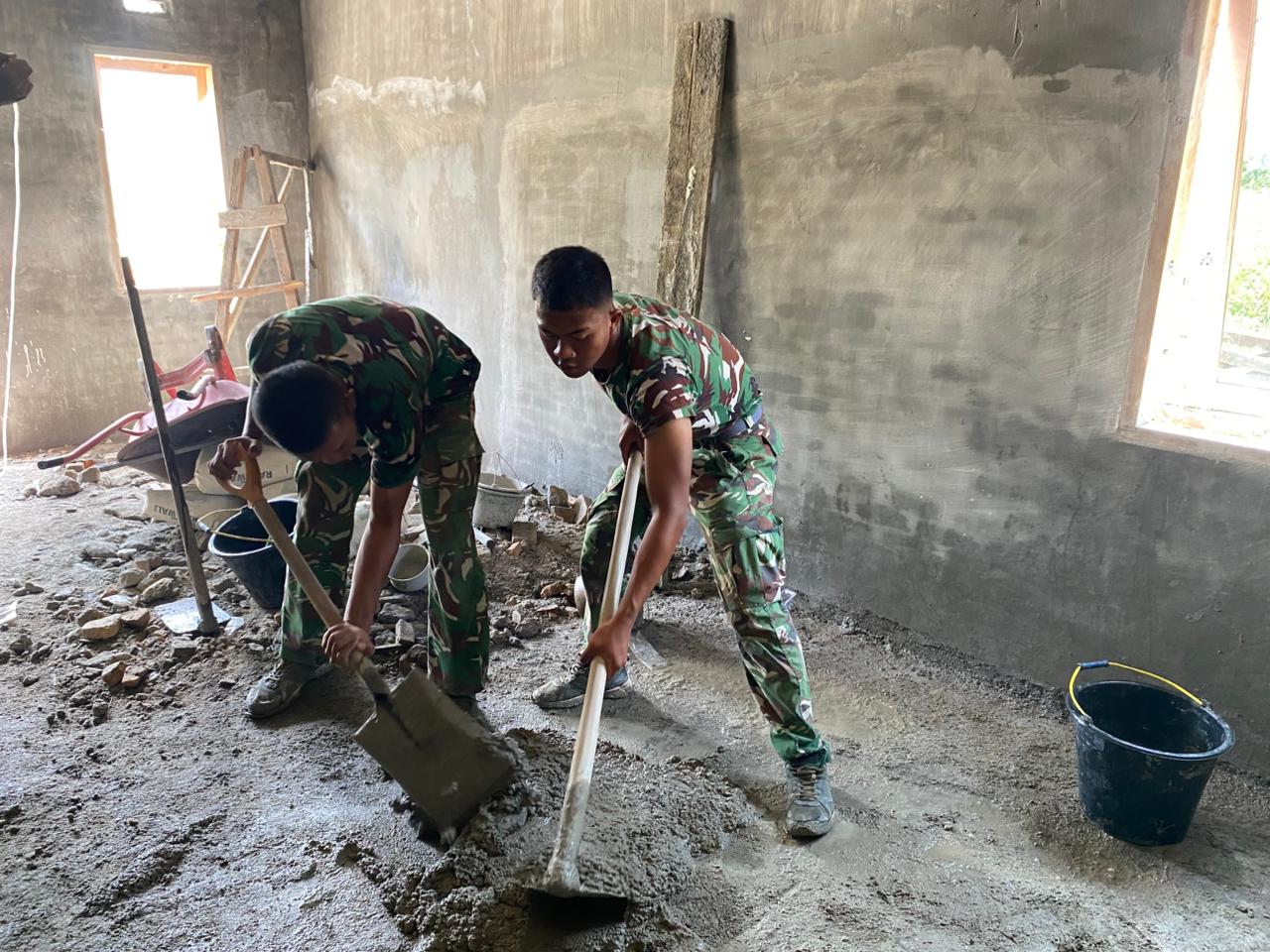 Dengan penuh semangat, para prajurit bekerja secara gotong royong, memastikan setiap bagian dinding rumah terpasang dan diplester dengan rapi. Proses pengerjaan ini dilakukan secara bertahap namun terus dikebut agar pembangunan rumah dapat segera selesai sesuai target.