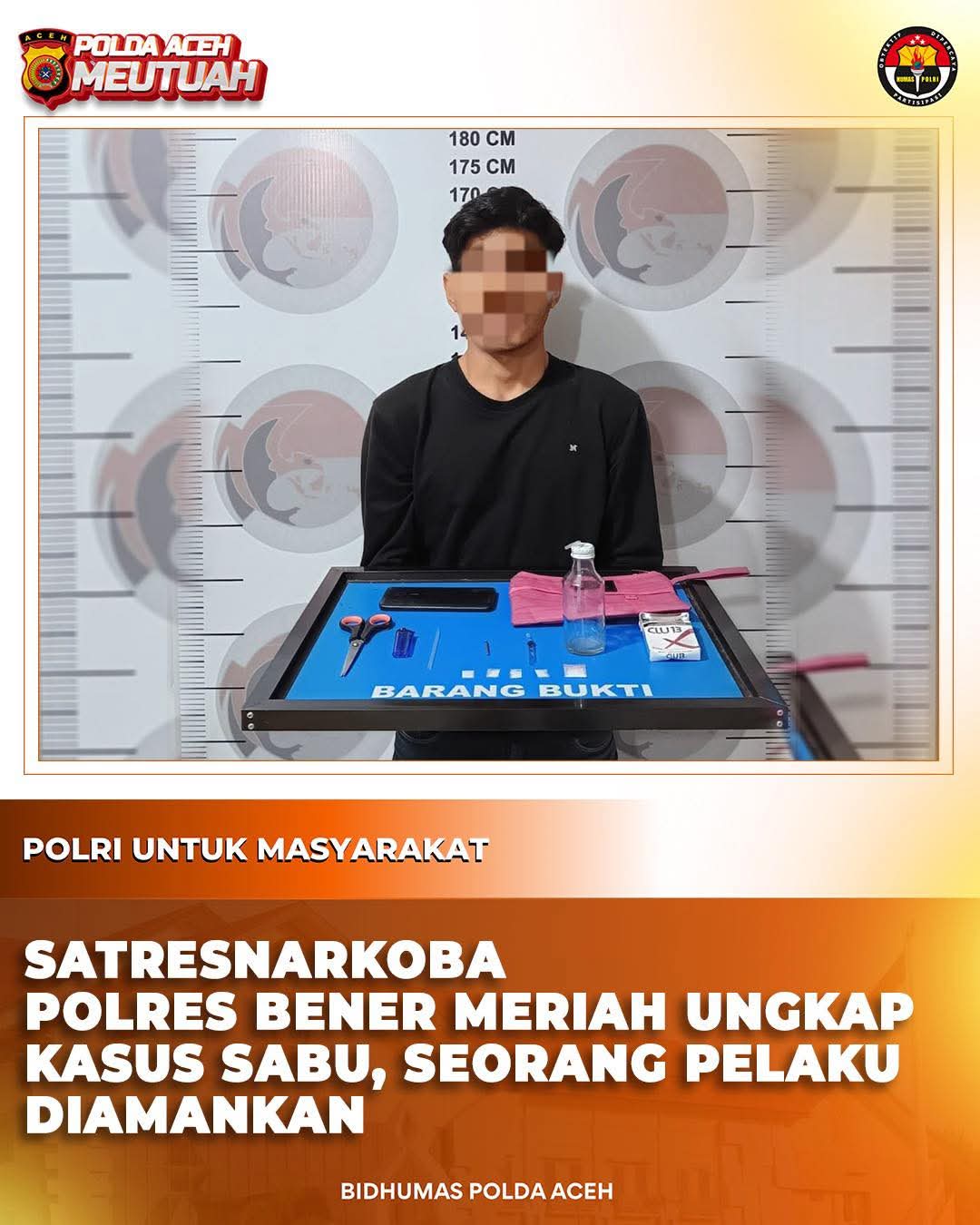 Media Sinergitas TNI-Polri News,Aceh,Bener Meriah – Satuan Reserse Narkoba (Satresnarkoba) Polres Bener Meriah kembali berhasil mengungkap kasus tindak pidana penyalahgunaan narkotika jenis sabu di wilayah hukumnya. Dalam pengungkapan tersebut, petugas berhasil mengamankan seorang pelaku beserta sejumlah barang bukti.Penangkapan dilakukan pada Senin, 9 Februari 2026, sekira pukul 00.03 WIB, di sebuah rumah yang berada di Desa Blang Ara, Kecamatan Bukit, Kabupaten Bener Meriah.