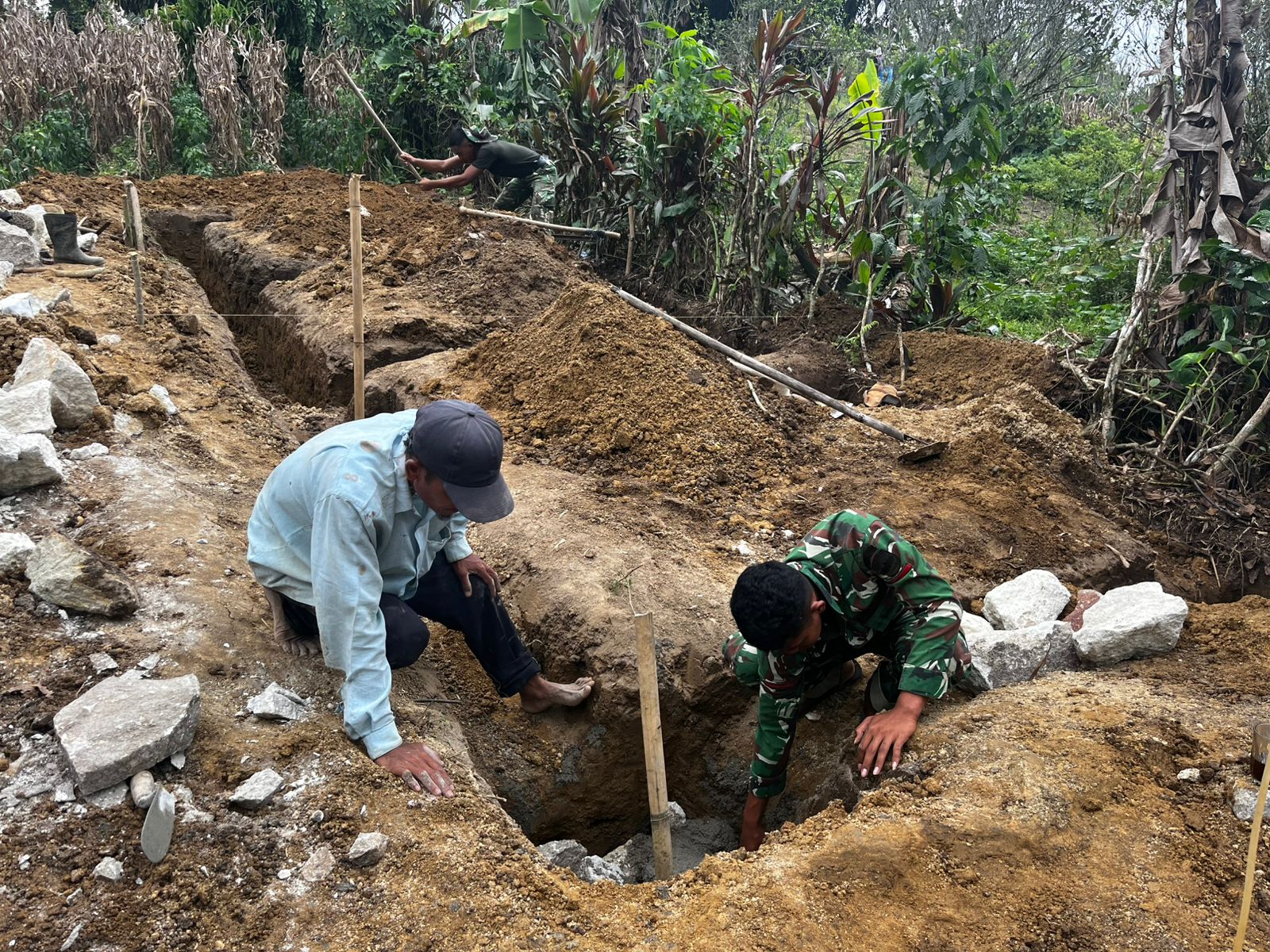 Sejak pagi, prajurit TNI bersama warga tampak kompak mengerjakan pondasi dengan penuh dedikasi. Campuran semen diaduk, batu disusun rapi, dan tawa kebersamaan sesekali terdengar di sela-sela pekerjaan. Gotong royong menjadi energi utama yang menggerakkan pembangunan di desa tersebut.