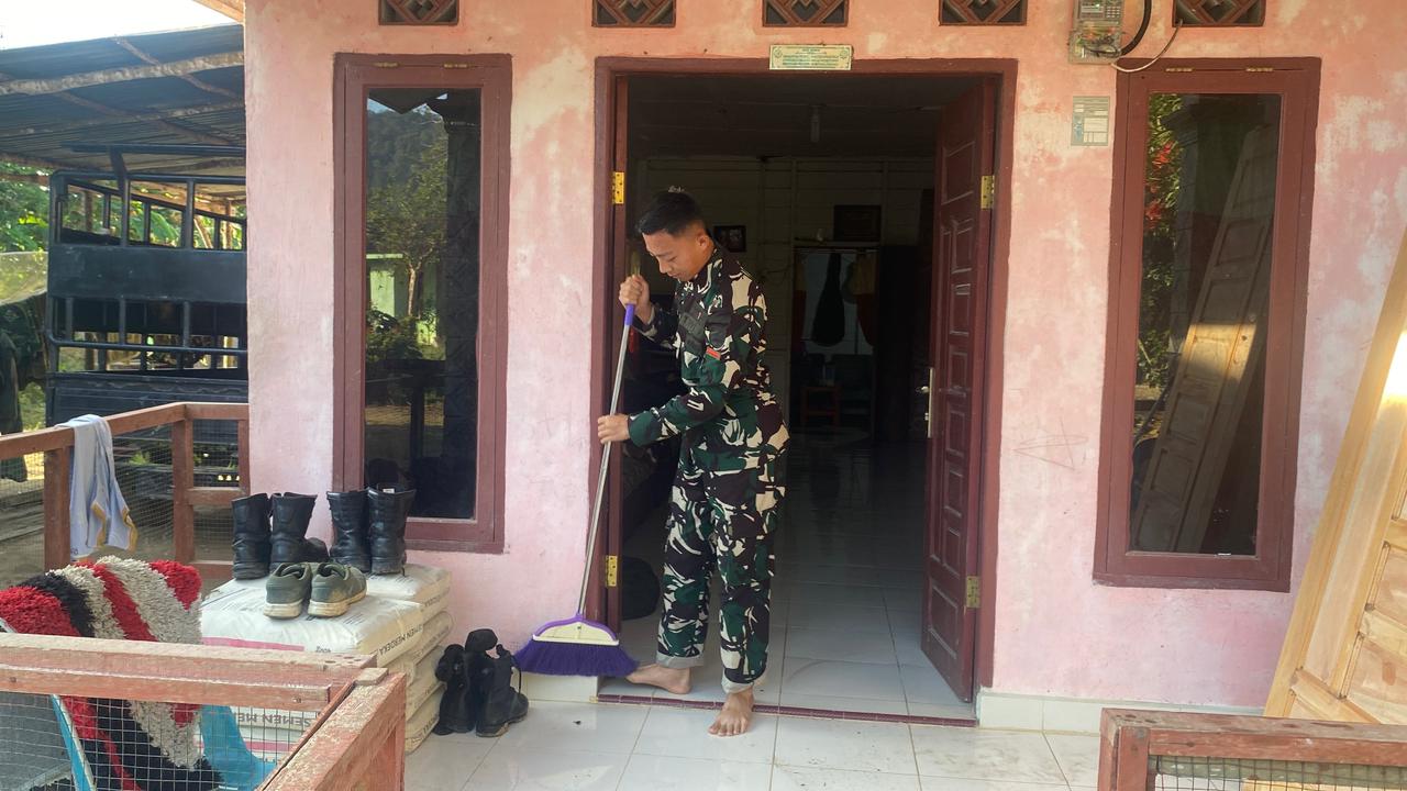 Dengan penuh kepedulian dan kebersamaan, personel Satgas membersihkan bagian dalam maupun luar rumah. Mereka menyapu halaman, merapikan lingkungan sekitar, hingga memastikan rumah tampak bersih dan nyaman dihuni. Suasana hangat dan kekeluargaan begitu terasa selama kegiatan berlangsung.