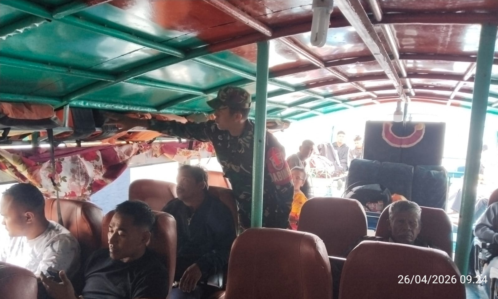 Di tengah aktivitas penyeberangan yang cukup ramai, Serda Julhalim menyapa para penumpang kapal feri maupun kapal kayu yang hendak menyeberang. Dengan pendekatan yang humanis, ia memberikan imbauan agar seluruh penumpang selalu mengutamakan keselamatan selama perjalanan.