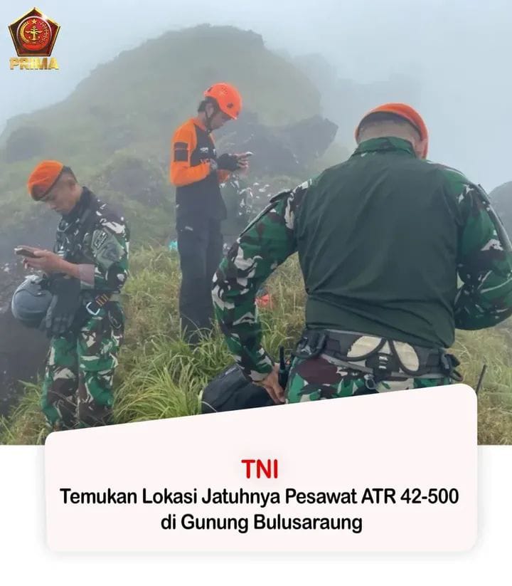 Media Sinergitas TNI-Polri News, (Puspen TNI). Tentara Nasional Indonesia (TNI) melalui Tim Search and Rescue (SAR) TNI Angkatan Udara berhasil menemukan lokasi jatuhnya pesawat ATR 42-500 milik Indonesia Air Transport (IAT) di Gunung Bulusaraung, Kabupaten Maros, Sulawesi Selatan, Minggu (18/1/2026).