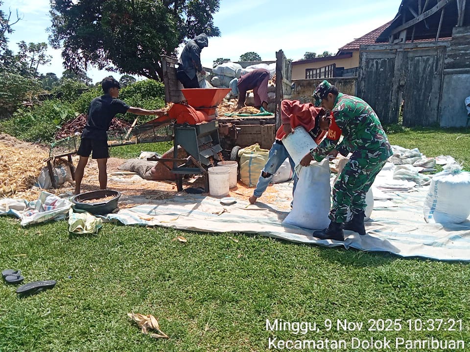 Media sinergitas TNI-Polri News, Simalungun — Dengan penuh semangat kebersamaan dan kepedulian terhadap para petani di wilayah binaannya, Babinsa Koramil 09/Tiga Balata Kodim 0207/Simalungun, Serda Jataksir Purba, melaksanakan kegiatan monitoring ketahanan pangan (Hanpang) dengan turun langsung membantu proses penggilingan jagung milik Bapak Erwin Sinaga di Dusun II, Nagori Marihat Marsada, Kecamatan Dolok Panribuan, Kabupaten Simalungun, pada Minggu (9/11/2025).